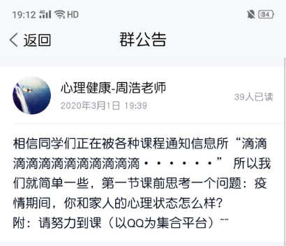 对于周浩老师来说,新学期第一堂课虽然隔着屏幕,但同学们依然按时到课并积极参与讨论。在围绕“疫情期间心理状态“的主题分享中,大家一起深入浅出地学习了应激反应、代际差异、情绪耗竭等概念,整体气氛轻松愉快。周浩老师表示,接下来网络授课的教学内容会适当掌控教学进度,形成在线教学流程上员工自学环节与教师授课环节间的知识结合,同时将重心放在教学设计、课堂组织上,按照自己的想法,利用自身已有的专业知识,实施更为有利的教学方法与教学手段,在展现了教师个人风格的同时,让教学效果也得到充分保障。