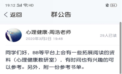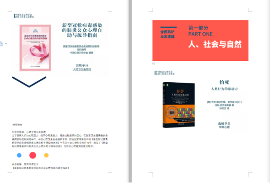 为了增加同学们的积极体验,增强同学们的情感共鸣,强化每一个人对“全国人民幸福共同体”的群体认同,心理课程中适度增加了最富有艺术感染力的音乐元素,例如一首纯音乐歌曲《光》的分享。另外,旨在延展同学们对于课程内容的认知边界,进一步巩固线上教学“全科视角”的教育效果,同时做好防疫“第二战线”上的政策解读、舆论引导、心理疏导等思想政治工作,一份详尽的书单提供了较为全面且专业的能力提升通道,包括全国卫健委组织编制的《新型冠状病毒感染的肺炎公众心理自助与疏导指南》、中国心理学会推荐的读物《人生公司》、《象与骑象人》、《控制焦虑》、《乌合之众》、《枪炮、病菌与钢铁:人类社会的命运》等。