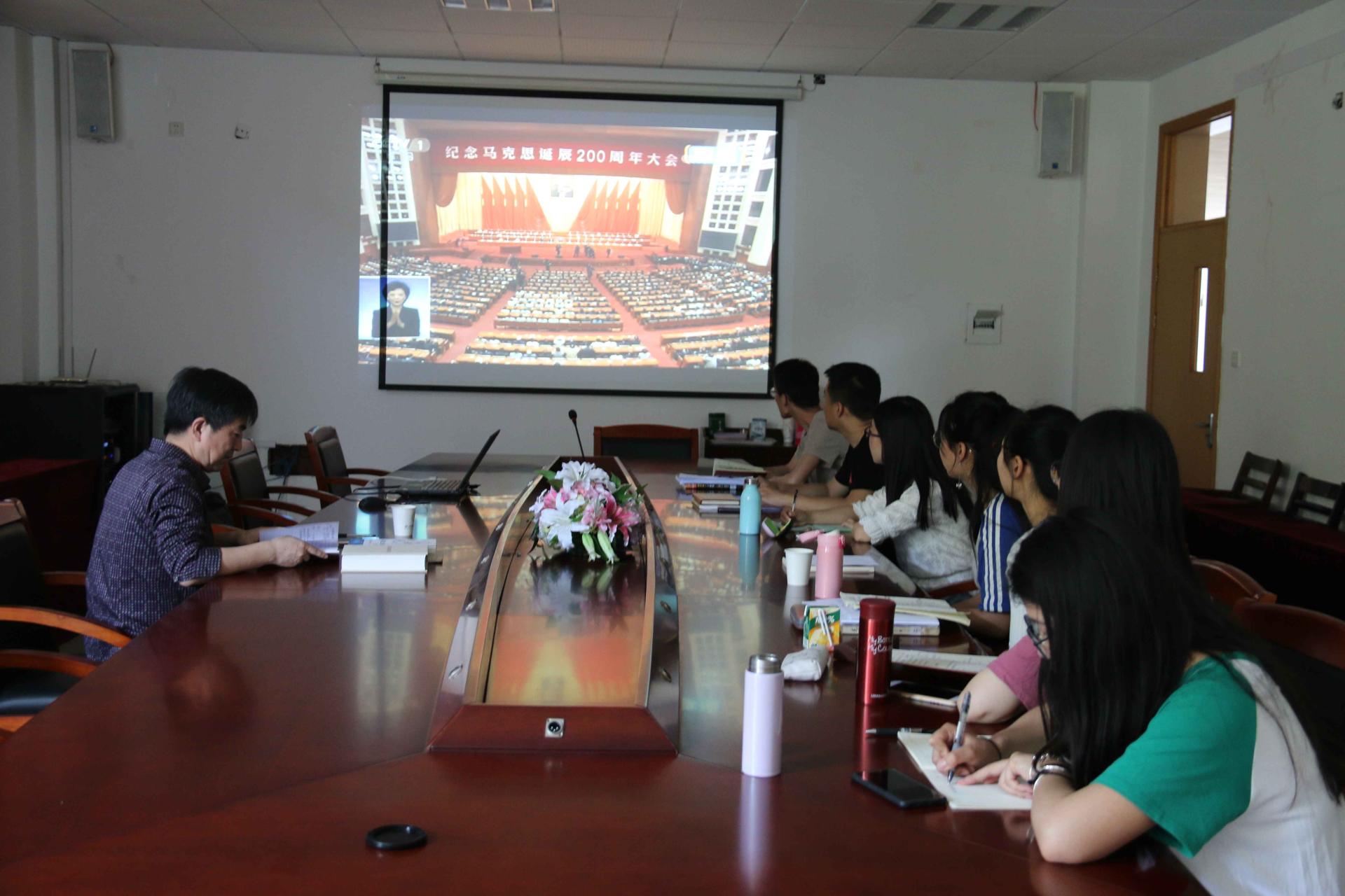2018年5月4日上午十点,中共中央纪念马克思诞辰200周年大会在人民大会堂隆重举行。在此时段内,正在开设“马克思主义中国化历史进程与基本经验研究”课程的申搏sunbet2017级马克思主义中国化研究专业研究生,在任课华正学老师的带领下,在公司会议室即时观看大会直播实况,并围绕习近平总书记在大会上的重要讲话展开了热烈讨论。