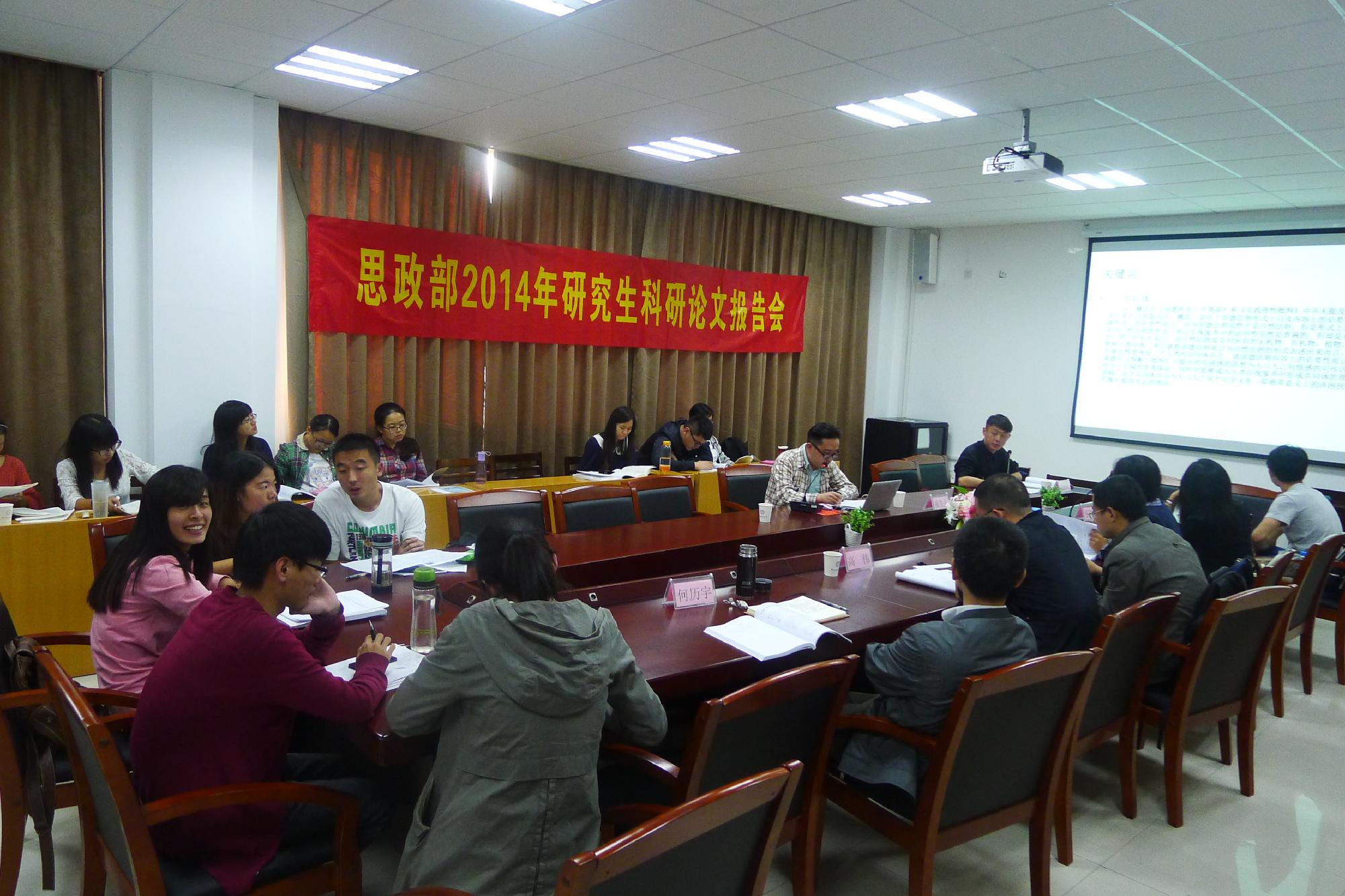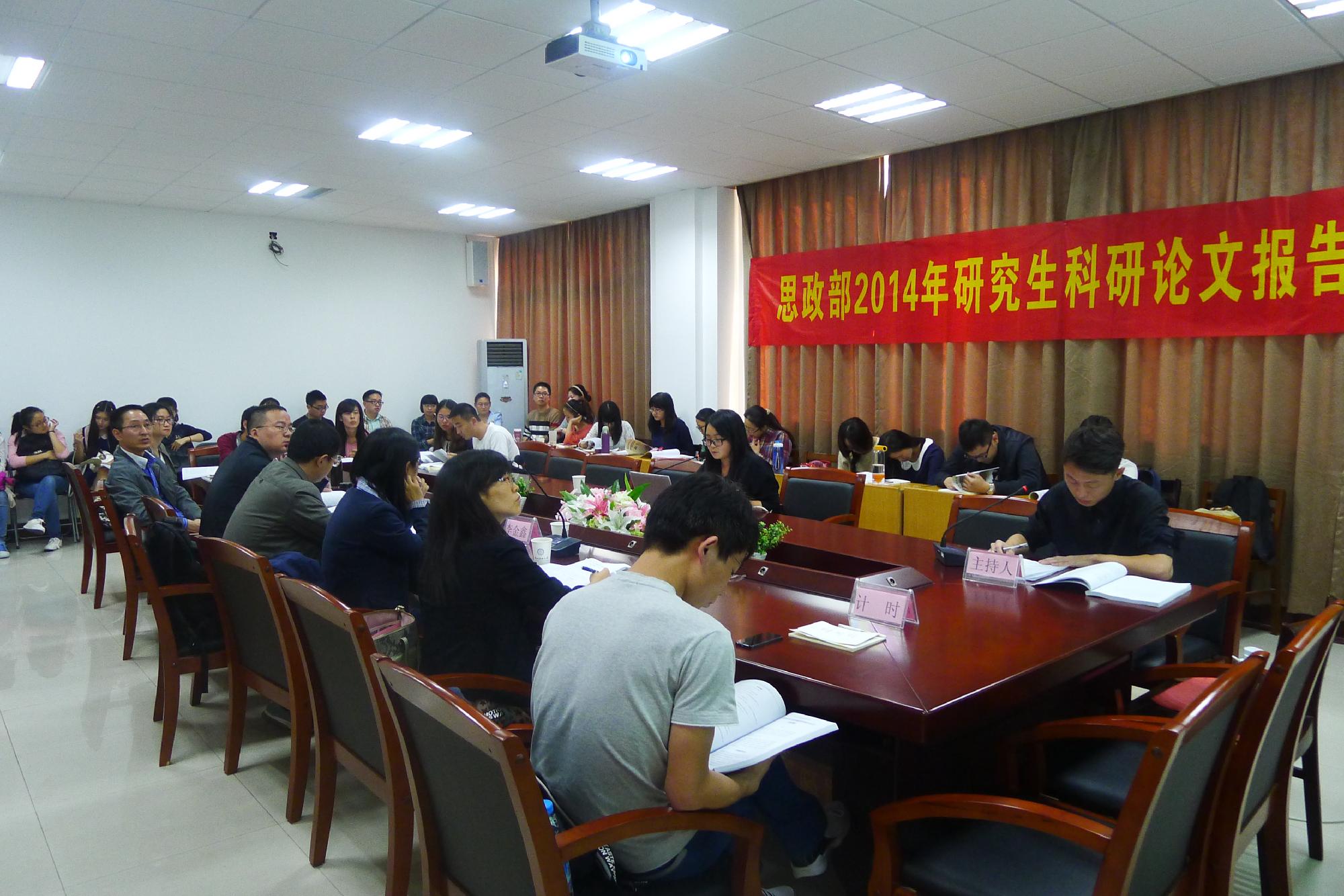 经过近三个月的认真筹备,10月24日下午,“思政部2014年研究生科研论文报告会”在3-211隆重举行。思政部领导、评委老师以及思政部全体研究生参加了此次论文报告会。