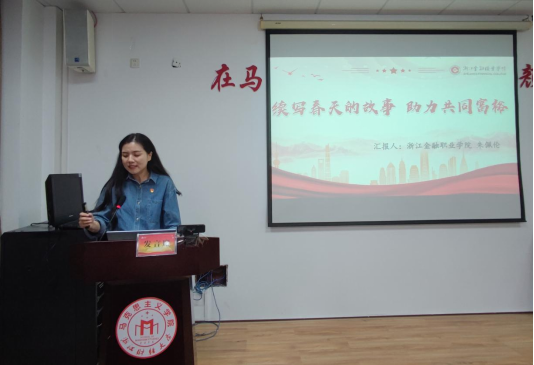 随后,浙江金融职业技术公司的朱佩伦老师用温柔而坚定的声音将一个个春天的故事向我们娓娓道来,生动体现了中国站起来、富起来、强起来的发展历程,致力于共同富裕的发展。最后,朱佩伦老师指出,春天的故事将继续,静待下个春天到来,下一个春天会叫伟大复兴。