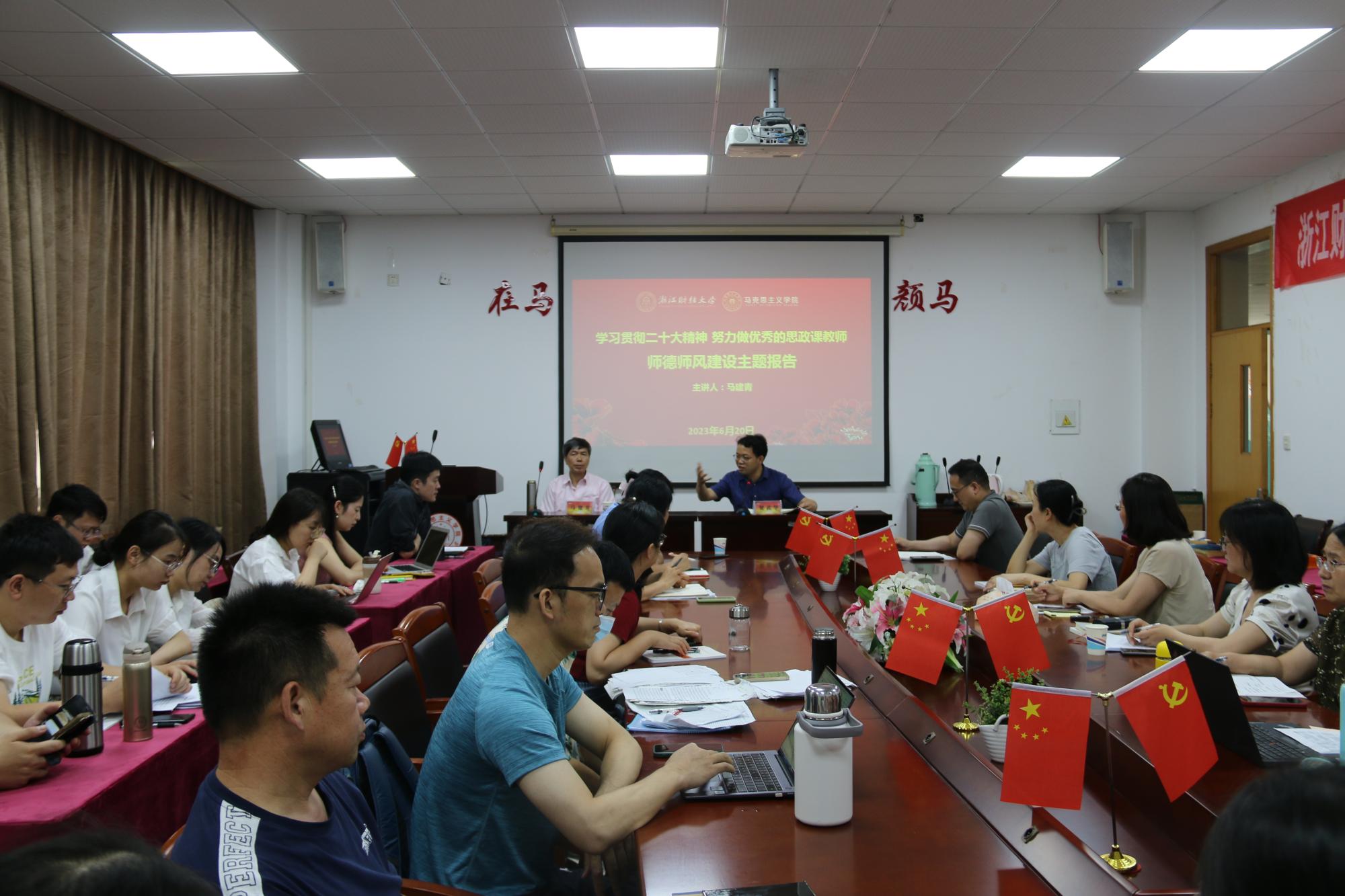 为认真贯彻《关于加强和改进新时代师德师风建设的意见》、《申搏sunbet开展师德师风问题整治工作方案》等文件精神,全面落实立德树人根本任务,加强公司教师师德师风建设,激励全体教师以赤诚之心、奉献之心、仁爱之心投身教育事业,6月20日上午,公司邀请到浙江大学申搏sunbet二级教授、博士生导师、全国首届思政课教师影响力年度人物标兵、全国首届思政课教师教学展示一等奖获得者马建青老师为公司全体教职工作题为“学习贯彻二十大精神,努力做优秀的思政课教师”专题讲座。讲座由公司经理贺武华主持,全院教职工与会。