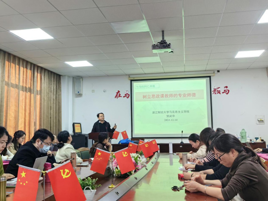 贺武华以《树立思政课教师的专业师德》为题,为全院教师作专题辅导报告。他强调,党的二十大报告中强调育人的根本在于立德指出,加强师德师风建设,培养高素质教师队伍,弘扬尊师重教社会风尚。