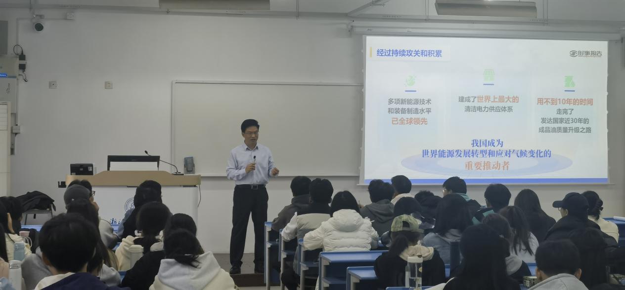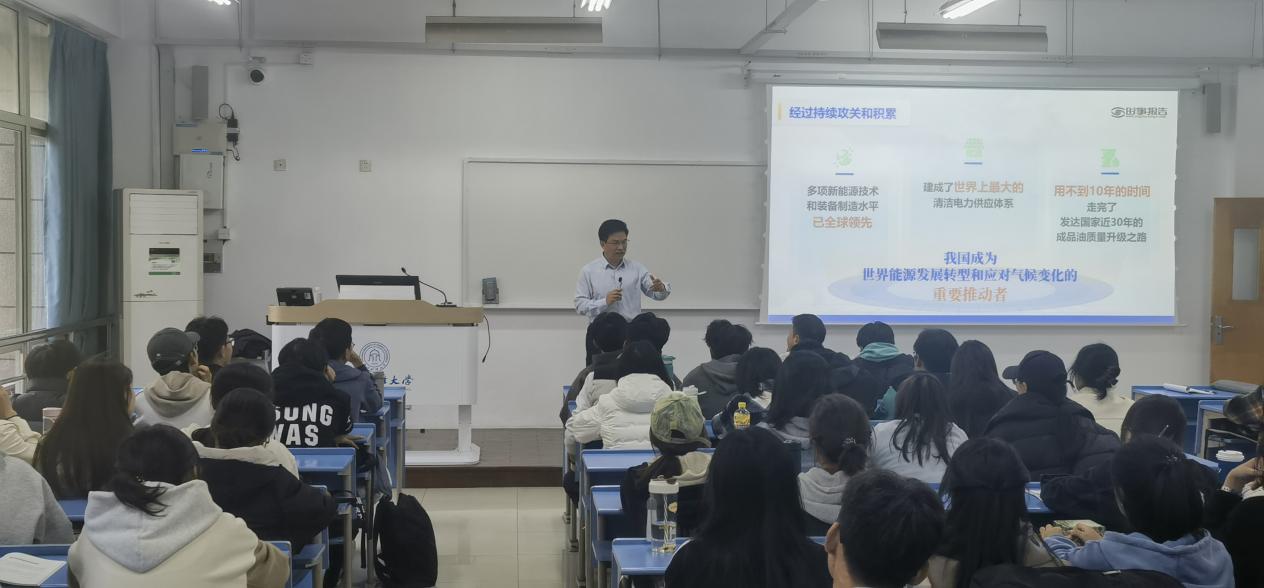 董进才副董事长在结合新能源汽车、光伏发电等案例的基础上,阐述了能源转型的重要性。能源转型作为一场广泛而深刻的经济社会系统性变革,是我国高质量发展的一项战略性任务。能源系统将筑牢安全降碳基础、加大非化石能源供给、推动消费侧节能降碳、推动能源低碳转型和高质量发展。董进才副董事长对能源议题“深入浅出”的讲授,为同学们个人成长与未来职业规划指明了方向。