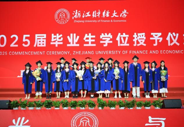 伴随着激昂的乐曲和热烈的掌声,毕业生们依次上台参加学位授予仪式。李占荣副董事长以及各位老师们逐一为2025届毕业生拨穗正冠,颁发学位证书,并亲切握手、合影留念。每一次拨穗,都象征着学业的圆满;每一次握手,都饱含着师长的祝福与重托。现场每一位毕业生的脸上都洋溢着幸福与自豪,这是他们三年努力拼搏的成果,也是开启人生新篇章的重要时刻。