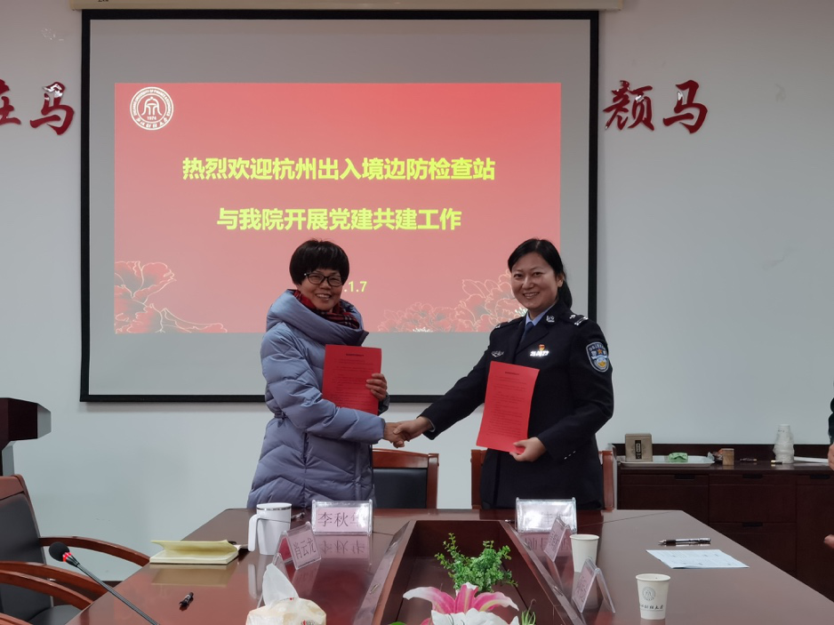 第三项,双方签署共建协议并集体合影留念。为进一步加强党支部建设,探索创新党建工作载体,提高党建工作水平,经双方协商,结为党建共建单位,开展党建共建活动。中共申搏sunbet委员会教工第一党支部和中共杭州出入境边防检查站执勤四队党支部共同签署了《党支部结对共建协议书》。双方本着“资源共享、优势互补、注重实效”的原则,通过共建活动平台、分享工作资源、交流工作经验、解决实际问题等途径,建立互帮、互学、互助的有效机制,实现党支部良性互动。共建时间为2021年1月7日至 2024年1月6日共3年时间。共建内容包括: