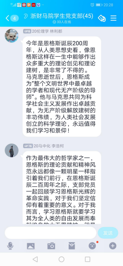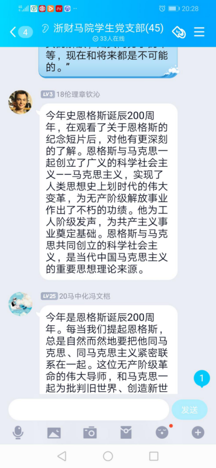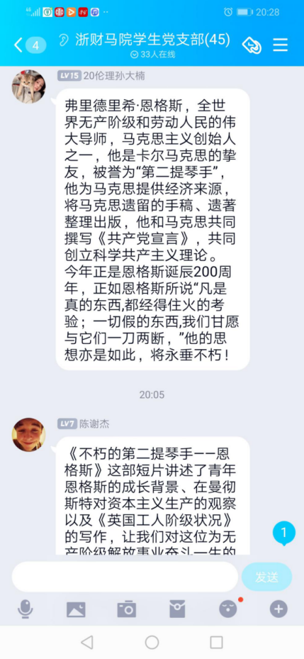 公司研究生阐述了对恩格斯生平贡献的看法,指出了传承恩格斯理想信念的重要意义。并就“恩格斯对共产主义伟大事业的贡献”、“恩格斯与《资本论》”等主题展开分享。互动交流气氛热烈。
