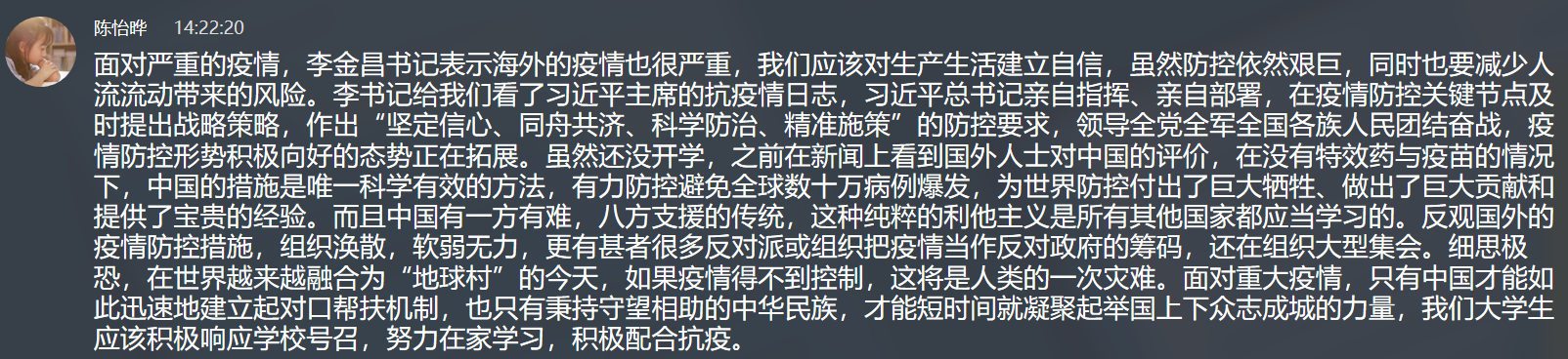 一个小时的公开课上,李书记例举了大量案例、数据,内容详实、深入浅出,还分别就每个话题与同学们互动交流、循循善诱,为公司老员工上了一堂厚植爱国主义情怀的疫情思政课。李书记的公开课在师生间引起热议,在教师的组织下员工对比了中外政治制度的差异,对我国社会主义制度的优越性进行深入讨论;师生共同回顾100多年来中华民族谋求解放的艰辛历史,思考讨论了蕴藏在伟大人民间的中国精神和中国力量。