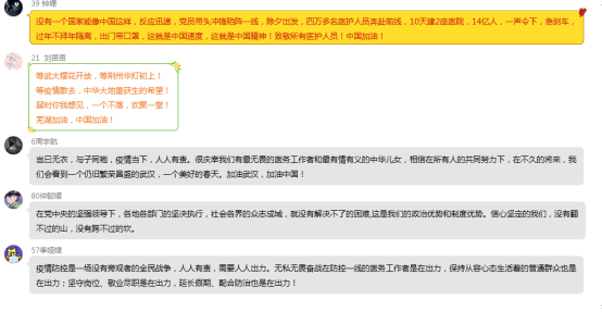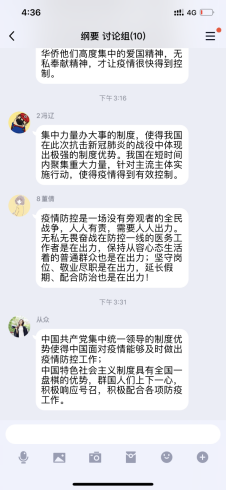 “抗疫,我们有中国制度”、“战疫时期的青年责任与担当”、“自然、疫情与我”、“重大疫情与敬畏生命”、“致敬医护人员”等等,这些都是马院老师在直播结束后和员工讨论的主题,而每一个问题之下都有数百条甚至上千条员工的热烈回应。韩金起老师班上18经贸1班的王烨同学追问“此次疫情防控过程中,哪些做法在中国可以做到,其他国家不可以,我们的优势有哪些?”来自肖云龙老师班上的寇雅洁同学从爱国主义、中国共产党领导和中国特色社会主义制度的显著优势和“四个自信”的角度分别谈了自己的看法;冯庆旭老师班上的郑烨波同学认为:“在重大疫情面前,生命可以脆弱的只是一个个冰冷的数字,同时生命也是顽强的,顽强到可以奋不顾身的奔赴战场。此次疫情让我们看到了青年的力量,也让我感受到了自我担当意识,危险当前,总是有人要付出,别人可为,我为何不可为呢?”