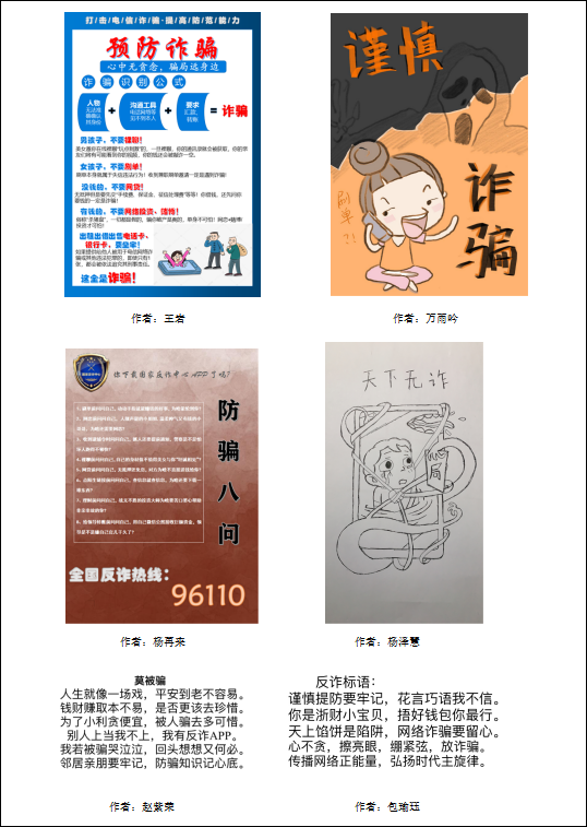 活动持续开展一周,活动期间同学们以“反诈宣传”为主题进行了多种形式的创意展现,内容包括分享经验、警示员工日常诈骗现象、分享举报方式等,形式涵盖宣传标语、原创海报、反诈短文等。27日,由团支部书记、班主任共同对参赛作品进行评比。最后,王岩、赵紫荣、万雨吟、杨泽慧、杨再来、包瑜珏创作的六组作品获得优秀奖。