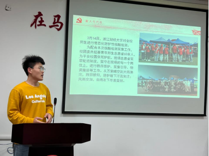 会议第二项议程,“薪火代代传”。会议中,通过图片展现了公司常态化防护性核酸检测志愿者坚守每一个岗位的坚韧风貌、彰显了公司同学于春运时期在杭州东站协助疫情服务的为人民服务的精神、表达了公司同学在家乡社区参与疫情物资援助的爱国爱家,与全国人民万众一心战胜疫情的信念。